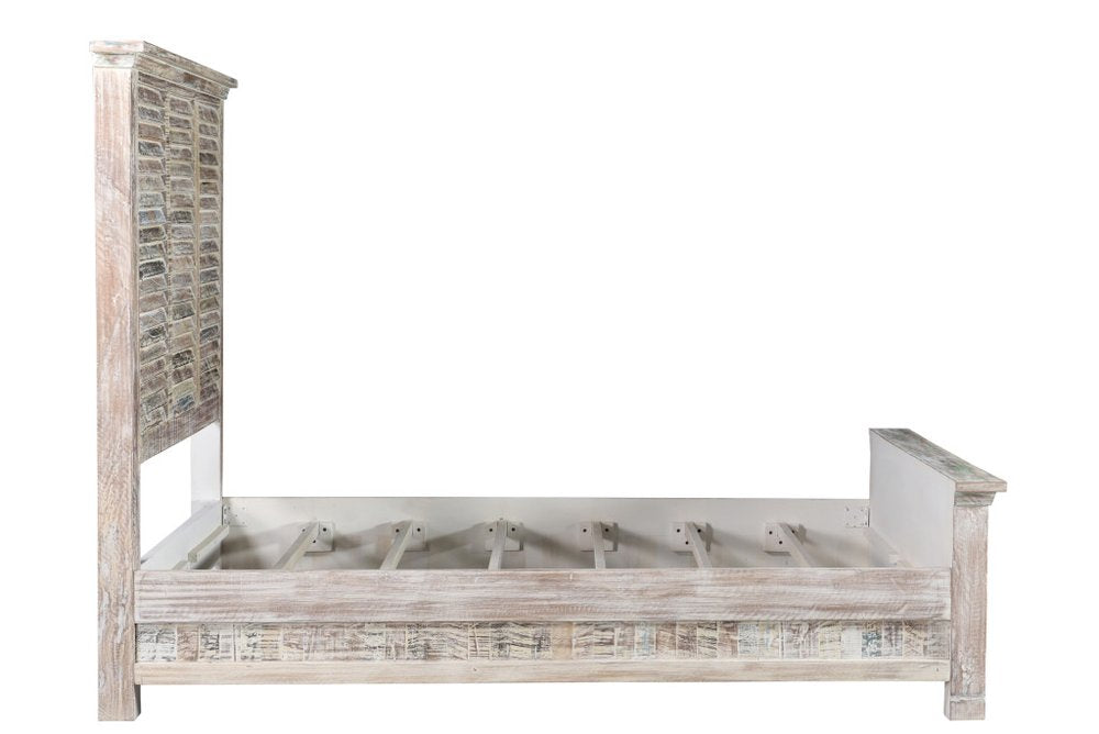 Drift off to a great night's sleep with the luxuriously stylish solid wood king gray bed. We spend so much time in our bedrooms, thus making quality craftsmanship and good looks vitally important. Featuring hand carved design and a distressed wash finish that highlights the beauty of genuine and natural wood. This bed will help to create a peaceful environment that will provide restful slumber for years to come. 66" H x 84" W x 89" D