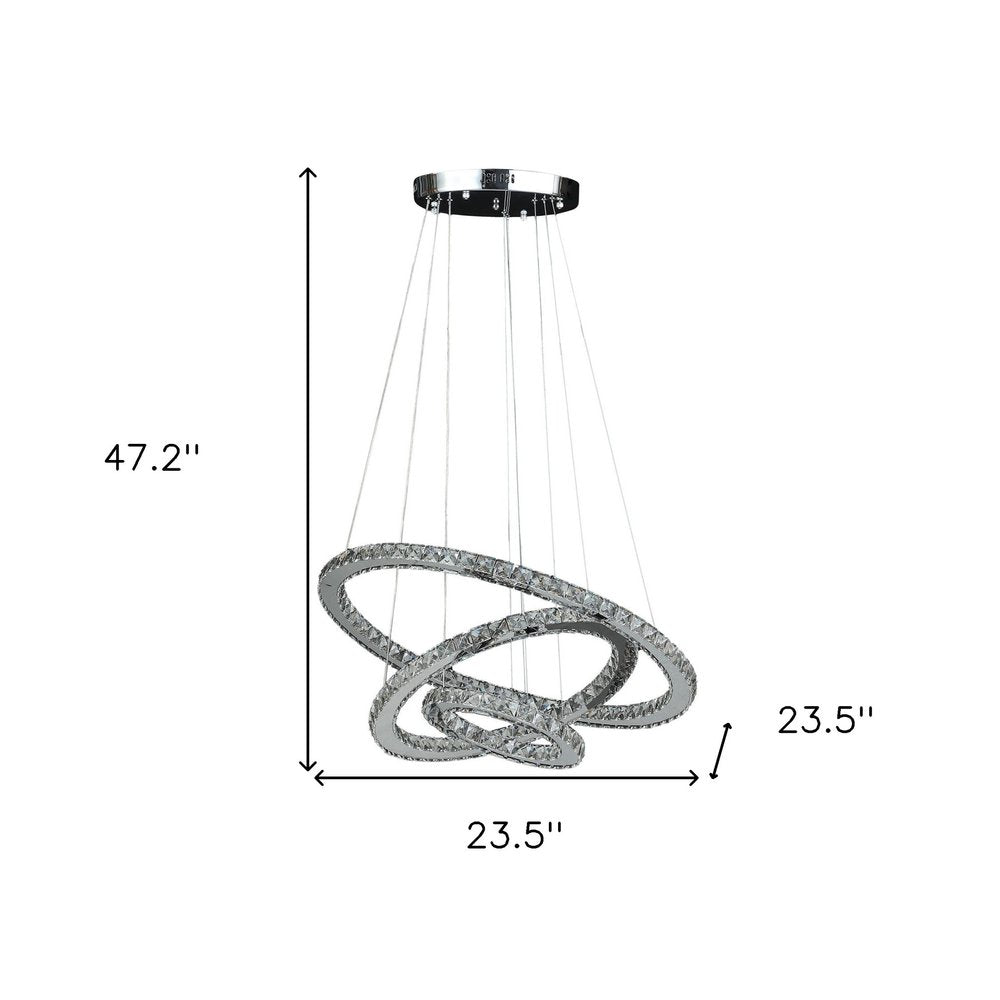 Illuminate your home in style with this silver metal and crystals led dimmable chandelier. A silver finish, gives this light a classic and neutral tone to blend into many decor styles. This light will require hardwiring installation. Featuring 3 distinct levels of light, this piece will bring a special glow to your room. Get creative and change up the look of any room from hallway, to closet, to office or bedroom with this gorgeous hanging chandelier light fixture. 47.2-inch H x 23.5-inch W x 23.5-inch D