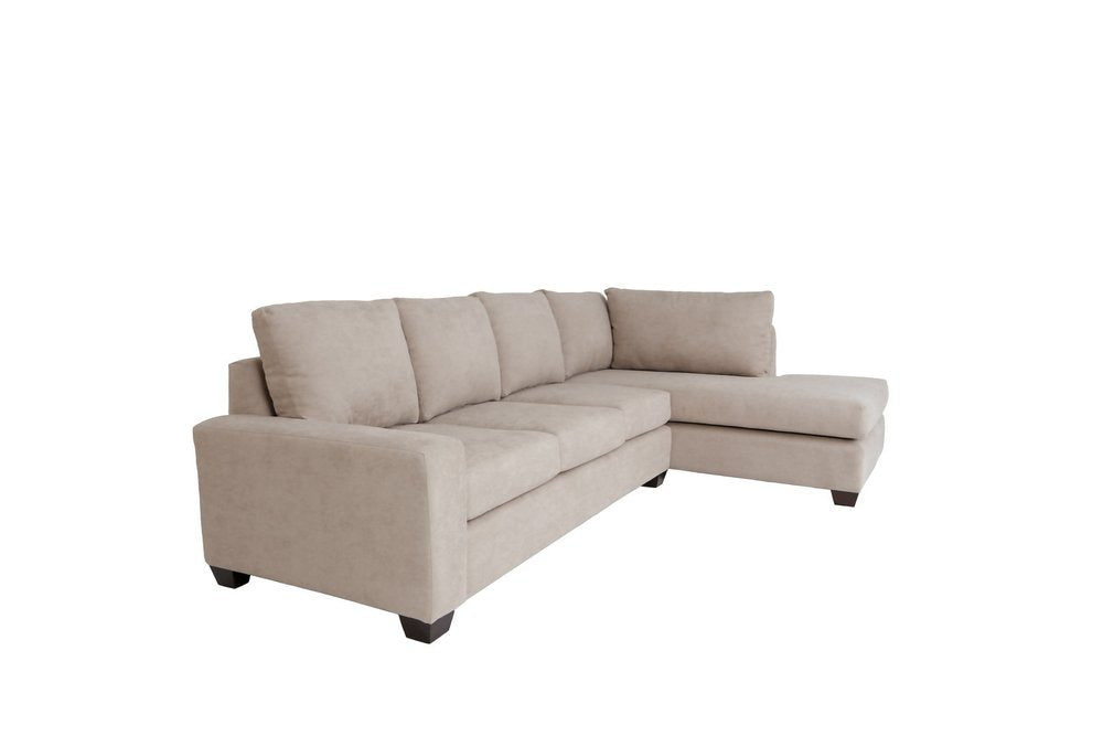 The tan polyester blend stationary l shaped two piece corner sectional is spacious design meticulously crafted with extraordinary cushion comfort and ultimate durability so everyone in your home can have the best seat in the house. Square arms offer a comfy place to rest. Dark brown solid wood legs effortlessly elevate the room and add a touch of contemporary design. A great showpiece for your room, this sectional is a must have. 36" H x 115" W x 37" D