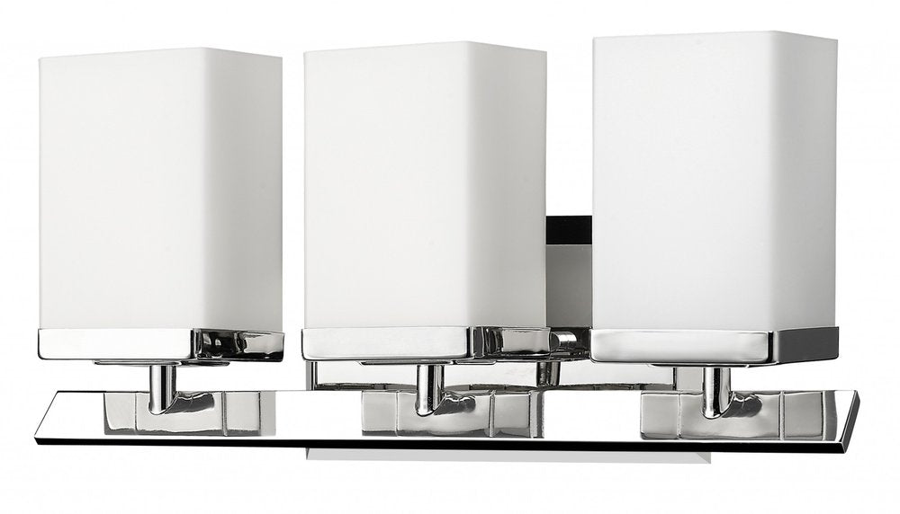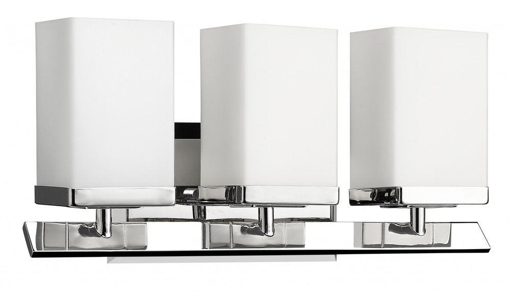 Elevate the look of any space easily and add brightness to it with this Three-Light Silver Frosted Glass Wall Sconce. The wall bracket has a general rectangular shape with beveled edges and a wide body. Attached to there is a flat piece of metal that holds the three lights on top of it. The hardware pieces are all colored to a silver finish. The shades are made from frosted glass and are in a short rectangular shape for the perfect soft touch. This wall sconce will look great on its own in the hallway or entryway, or you can put up a few in any room to freshen up the decor. 8" H x 16" W x 5.5" D