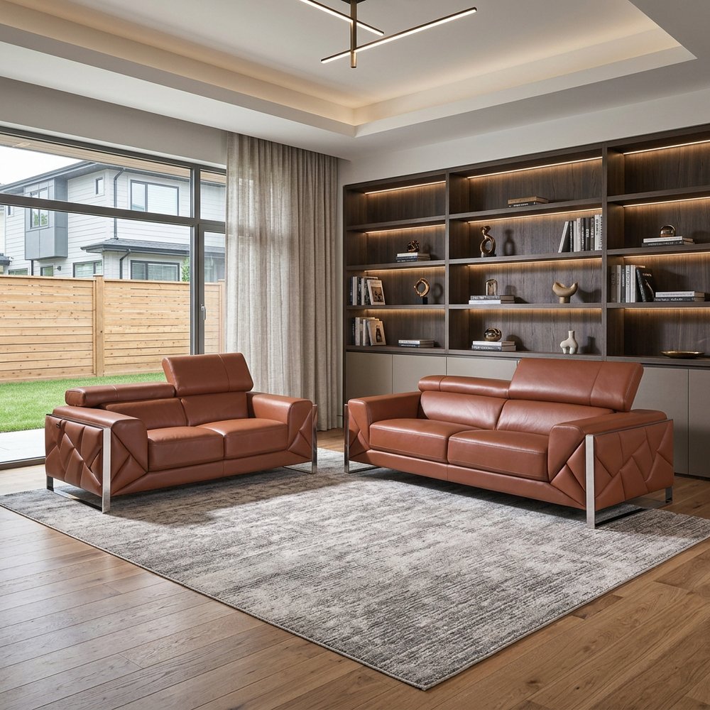 Step into a world of unparalleled seating comfort that is sure to dazzle even the toughest critic with our remarkable two piece indoor camel italian leather five person seating set. Upholstered in supple and luxurious genuine leather, this set has a rich and warm appeal. The presence of coil spring seat construction helps distribute weight evenly, reducing pressure points and enhancing overall comfort by minimizing the strain on specific areas of the body. The inclusion of a loveseat into your mix allows a fashionable seating option in a compact design. Gather with family and loved ones with this seating set that will bring you all together. 35-inch H x 90-inch W x 42.5-inch D