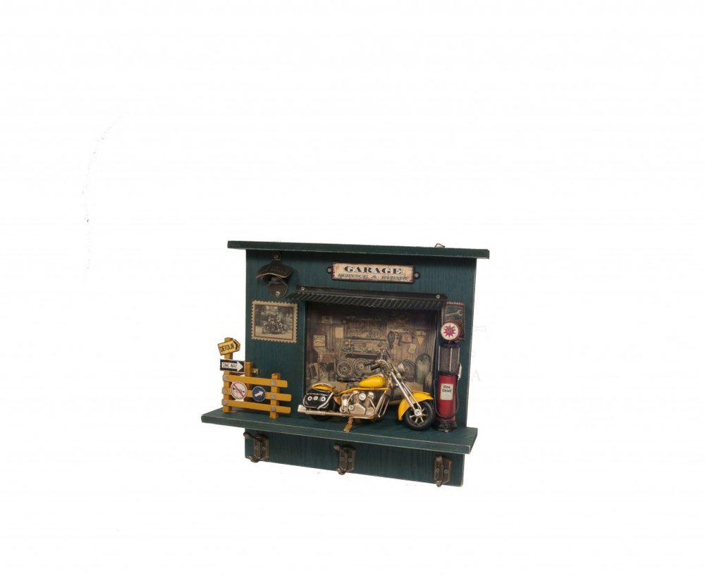 Charming and eye-catching, the Vintage Harley Garage Key Organizer features a yellow vintage Harley motorcycle in front of a garage. It has three hangers for organizing your keys and a super convenient bottle opener. It is a great practical gift for all Harley Davidson fans. 15'' x 16.5'' x 4.5"