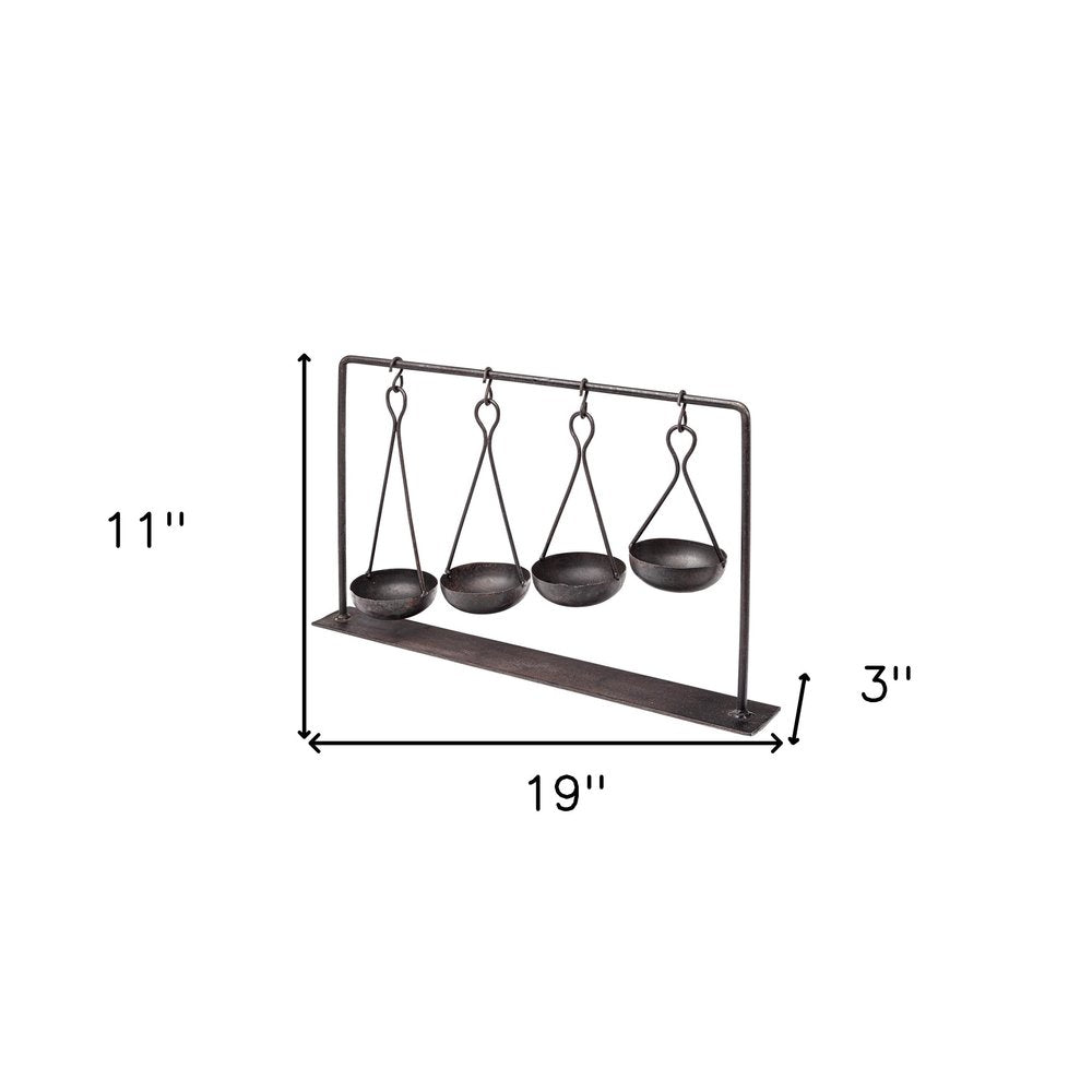 This vintage look metal spice rack is the perfect way to add some traditional yet modern industrial decor to your home. This decorative piece is made from solid metal and has a charcoal gray finish on it that is distressed to give it that vintage look. Hanging from the frame there are four hooks which hold in place the four metal bowls. These bowls are hung in varying heights which adds depth and dimension to this whole piece. This unique sculptural decor will add dimension to your space. 11" H x 3" W x 19" D