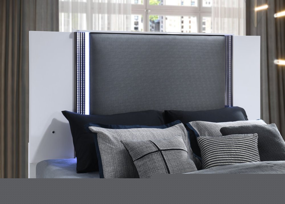 Add a luxuriously appointed bed that will help you create an oasis of comfort and relaxation in your home with this white and gray wood and faux leather lighted king bed frame. Partially upholstered in a gray, rugged faux leather, this bed brings a unique and designer perspective to your space. We spend so much time in our bedrooms, thus making quality craftsmanship and good looks vitally important. The addition of LED lighting in the headboard gives this bed some special flair. This bed is the perfect way to make your bedroom comfortable and inviting. 61-inch h x 86.2-inch w x 79.4-inch d.