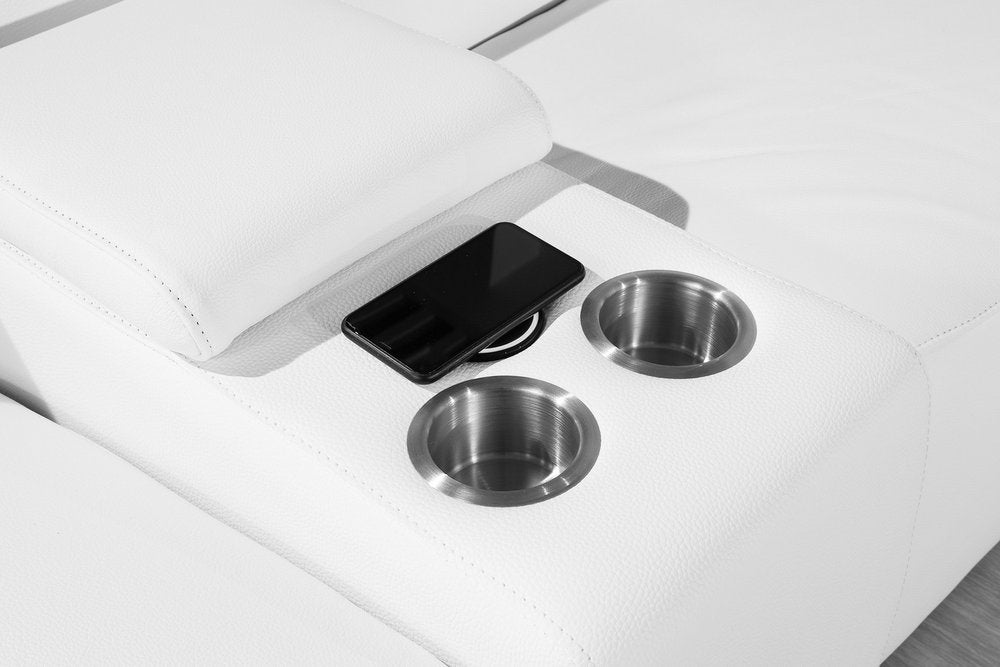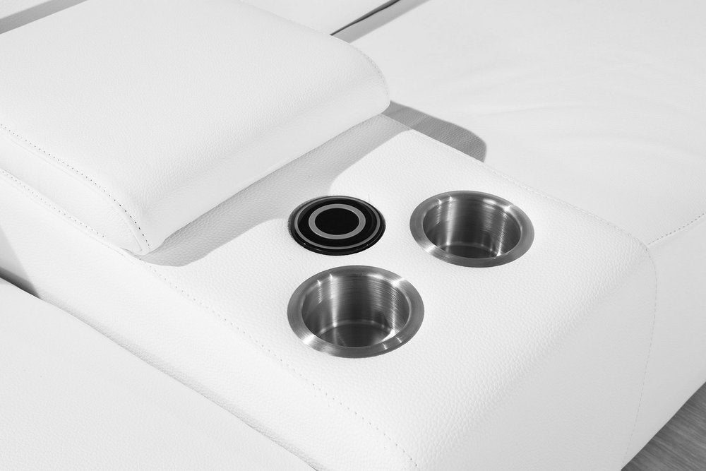 Take your relaxation to the next level with this super soft and comfortable white italian leather power reclining u shaped six piece corner sectional with console. The high-end premium leather used makes your lounging luxuriously comfortable and adds an elegant appeal to your space. Solid colors give you lots of decorative options and are easy to work into your decor scheme. For the ultimate in relaxation, this sectional includes power - push button recline that turns it into a comfy lounge for sleeping or resting. Silver metal legs effortlessly elevate the room and add a touch of contemporary design. Great for everyday lounging and for entertaining, sectionals are an ideal way to seat multiple people. 35-inch H x 123-inch W x 110-inch D