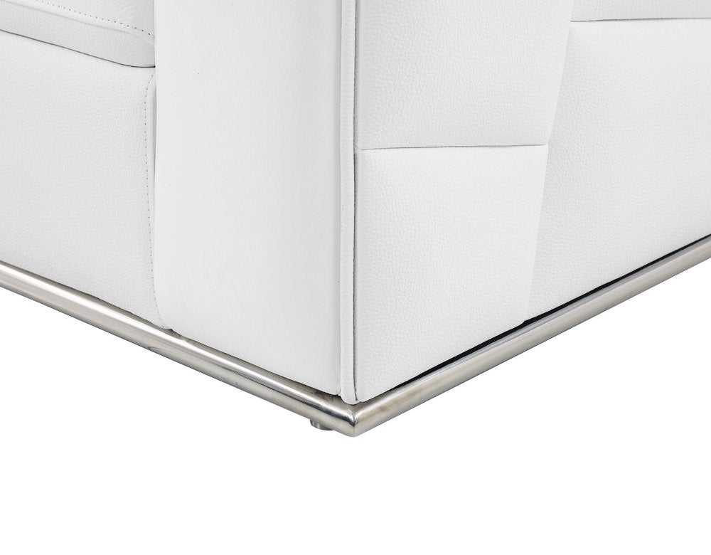 Made of the highest quality, supple leather, this white italian leather reclining l shaped two piece corner sectional will be the star of your space. The high-grade premium leather used makes your lounging luxuriously comfortable and adds an elegant appeal to your space. Solid colors give you lots of decorative options and are easy to work into your decor scheme. Square arms offer a comfy place to rest. Silver metal legs effortlessly elevate the room and add a touch of contemporary design. A great showpiece for your room, this sectional is a must have. 35-inch H x 117-inch W x 40-inch D