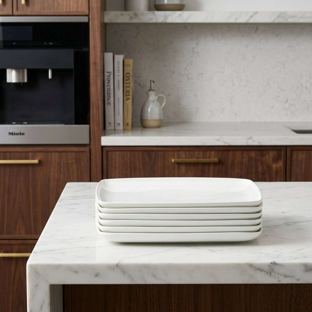 Enhance your dining experience with the white six piece rectangle porcelain service for six dinner plate set. This modern-style set includes six rectangular dinner plates, perfect for any occasion. Made from high-quality porcelain, these plates are chip resistant and dishwasher safe, making them easy to clean and maintain. The stackable design allows for convenient storage, while the white color adds a touch of elegance to your table setting. Microwave safe for added convenience, this dinnerware set combines style and functionality. Elevate your dining decor with this exquisite dinner plate set and impress your guests with every meal. 1-inch H x 10.5-inch W x 8.5-inch D