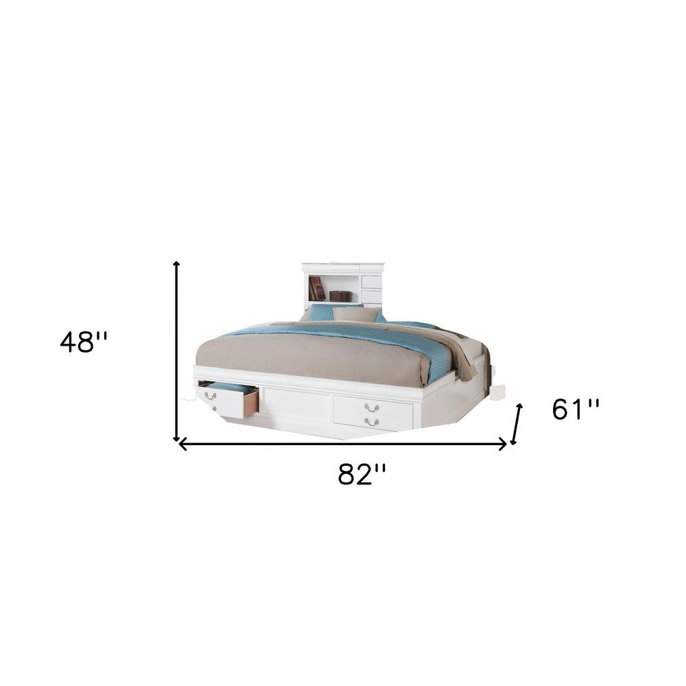 Create a haven for relaxation and sweet dreams with this fabulous white wood queen bed frame with four drawers. The versatile rectangular bookcase style headboard gives this bed easy access storage and display that is convenient and fashionable. Quality craftsmanship in every facet of production ensures durability and long-lasting wear. This bed will help to create a peaceful environment that will provide restful slumber for years to come. 48-inch h x 82-inch w x 61-inch d.