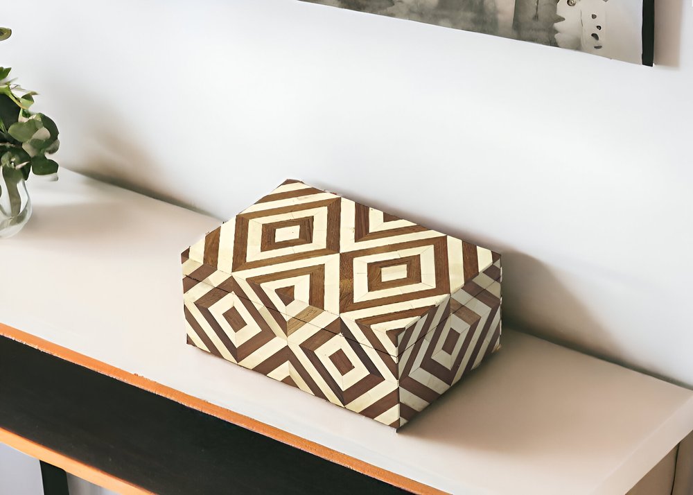 12" Brown And Ivory Wood And Bone Inlaid Geometric Storage Box